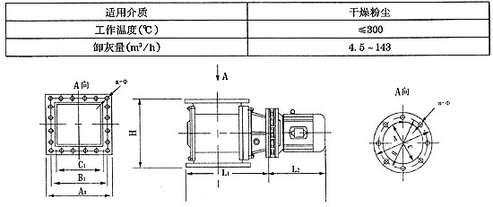 用途 該閥又名葉輪給料機(jī)、回轉(zhuǎn)下料器等,普遍適用于建材、冶金、化工、電力等部門作為各類除塵設(shè)備的卸料裝置及各種磨機(jī)、烘干機(jī)、料倉等設(shè)備的給卸料裝置。 結(jié)構(gòu)特點(diǎn) 該閥采用鋼板焊接結(jié)構(gòu)、葉片耐磨性好、葉片與傳動(dòng)軸鋼性連接、結(jié)構(gòu)緊湊、工作可靠、輕便節(jié)能。 工作原理 該閥由閥體、傳動(dòng)軸、葉片和減速器等組成,減速電機(jī)帶動(dòng)軸和葉輪旋轉(zhuǎn),完成給卸料。 型號(hào)編制說明