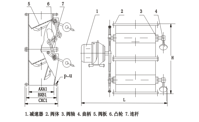 由減速器帶動(dòng)傳動(dòng)桿通過(guò)曲柄、凸輪及連桿分別帶動(dòng)上、下兩傳動(dòng)軸旋轉(zhuǎn),交互開(kāi)啟,通過(guò)配備的杠桿系統(tǒng)或拉伸彈簧,保證閥板可靠的復(fù)位,防止野風(fēng)吹入,依確定的開(kāi)閉頻率完成系統(tǒng)的給卸料。